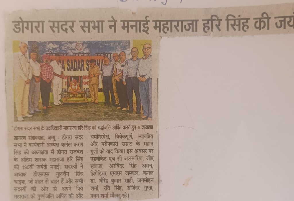 The Dogra Sadar Sabha (DSS) celebrated the 130th Birth Anniversary of Maharaja Hari Singhji, the last ruler of the Dogra Dynasty under the Chairmanship of the Offg President Col Karan Singh. Members paid floral tributes to their beloved Maharaja on behalf of the president DSS Th. Gulchain Singh Charak, who is out of station and all the members as they recalled the great qualities of the secular judicious, fair & caring emperor. The important members present on the occasion includes Adv. H C Jalmaria, G A Khwaja, Arvinder Singh Amn, Brig M S Jamwal, Col. Dr. Virendra Kumar Sahi VrC,  Jagmohan Sharma,Ravi Singh, Rajinder Gupta, Pawan Sharma